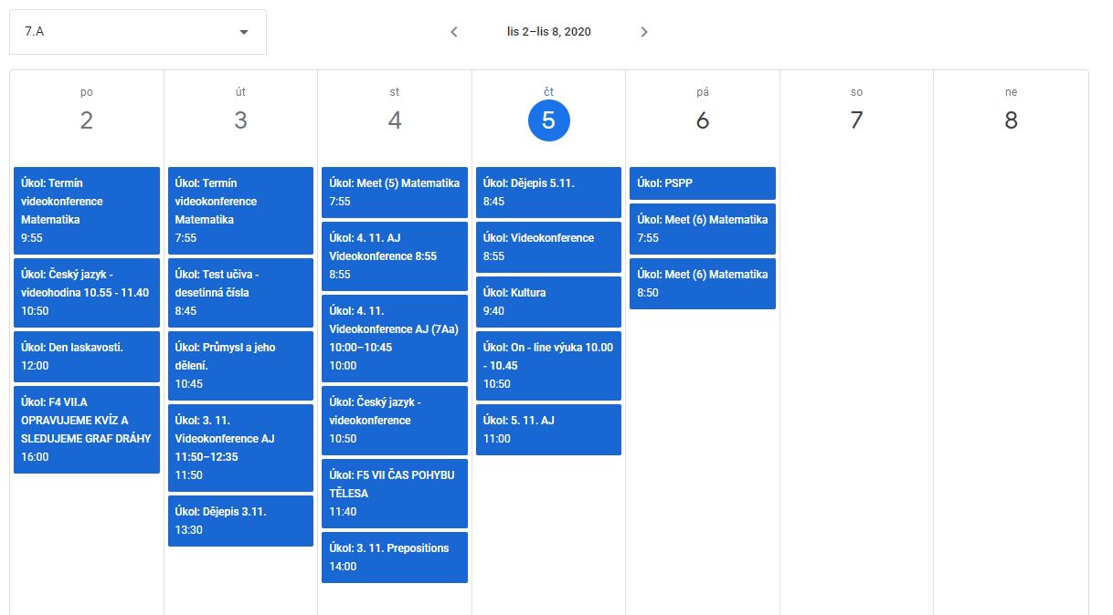 K přehledu, co žáky čeká, používáme Google Kalendář. Žáci už ví, že ho najdou v hlavním menu Google Učebny. Je to skvělý nástroj, kde se žákům ukazují konkrétní úkoly na den - včetně přímého odkazu do Google Učebny, aby ho mohli začít dělat.