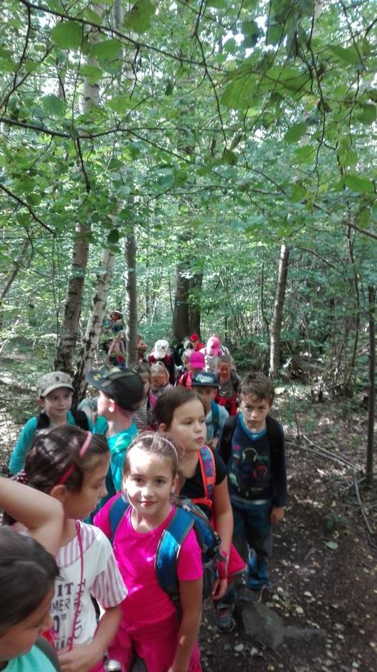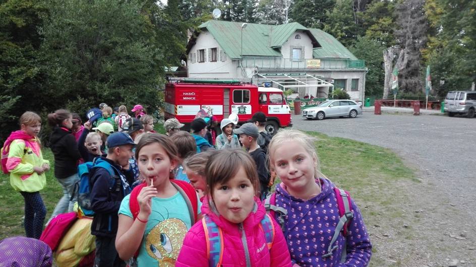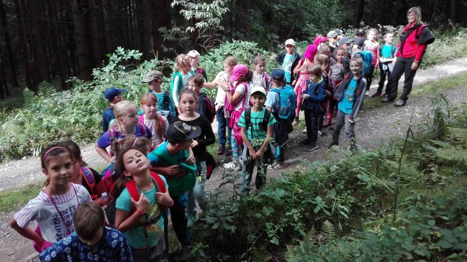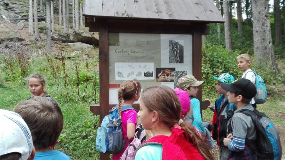 Za krásného počasí jsme vyšli od školy a modrá turistická značka nás zavedla ke studánce. Zde nás čekal první úkol - najít co nejvíce hub. Po splnění úkolu a malém občerstvení jsme se vydali dál směrem k Čertovým kamenům. Na Čertových kamenech byl připraven další úkol – najít hmyz, který žije v přírodě. Po vyhodnocení obou úkolů a odměnách jsme si na Čertových kamenech koupili něco dobrého, nasvačili se a pohráli na hřišti. Potom už nás čekala jen cesta zpět. Ta ubíhala rychle, a přestože nás na jejím konci zastihl déšť, s úsměvem jsme se vrátili ke škole, kde na nás čekali rodiče.