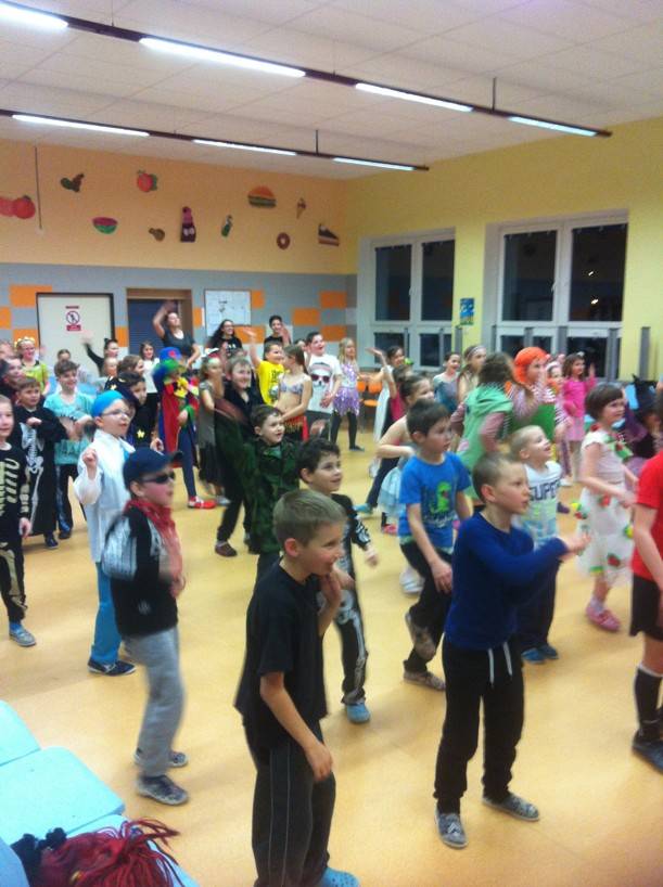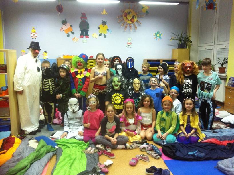 Po večeři jsme se všichni oblékli, namalovali, vzali si nezbytné doplňky k jednotlivým maskám a přesunuli se do jídelny. Tam jsme si užili večer plný tance a soutěží v krásných maskách. Pro odvážné jsme připravili procházku noční školou. Bez baterek, bez svíček, vedly nás jen oči. Unavení jsme v družinách ulehli ke spánku a spali až do rána. Po vydatné snídani a úklidu si rodiče přišli pro své děti. Děti odcházely domů plné zážitků a s úsměvem.