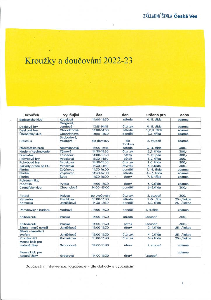 Nabídka kroužků a doučování ve školním roce 2022/2330.08.2022Volnočasové aktivity pro Vaše děti přímo ve škole! Bližší informace a přihlášky dostanou žáci u třídních učitelů.