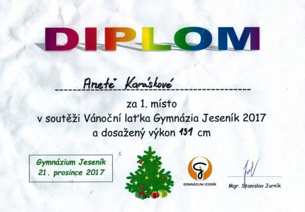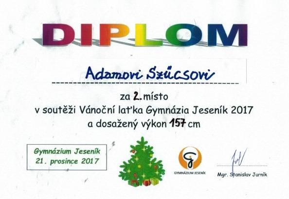 Vánoční laťka - okresní kolo18.01.20181.místo - Aneta Karásková, VII.A 2.místo - Adam Szücs, VIII.A Fotografie