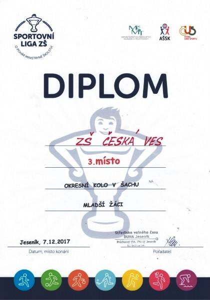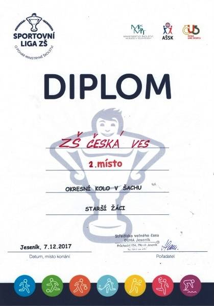 Přebor škol v šachu - okresní kolo18.12.20172.místo - Damian Vyhnánek,II.A, Artur Vaculík, III.B, Šimon Žerníček, Filip Svoboda, V.tř. 3.místo - Ondřej Čulák, Erik Skypala, V.tř., Lukáš Havlíček, VII.A, Alex Vaculík, VIII.B Fotografie