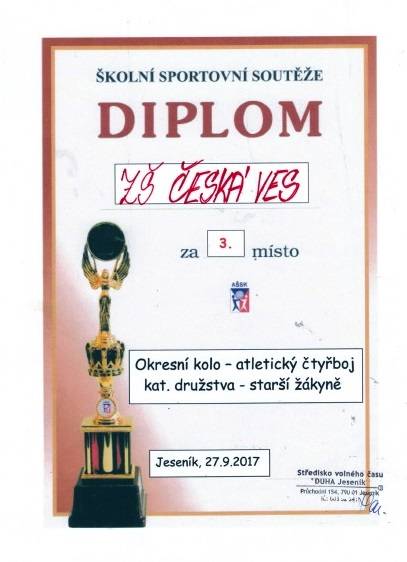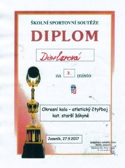 Atletický čtyřboj - okresní kolo18.12.20173.místo - Jana Diestlerová, VIII.B 3.místo - Vojtěch Rychlý, Matěj Krištofík, VIII.B, Pavel Dostal, Jan Bouchal, IX.A 3.místo - Distlerová Jana, Černěnková Jana, Pesselová Nela, Čermáková Gabriela, Závorová Julie, VIII.B Fotografie