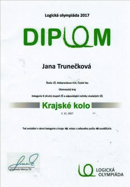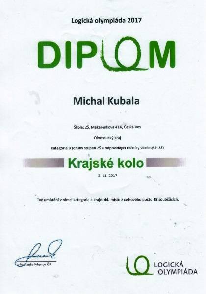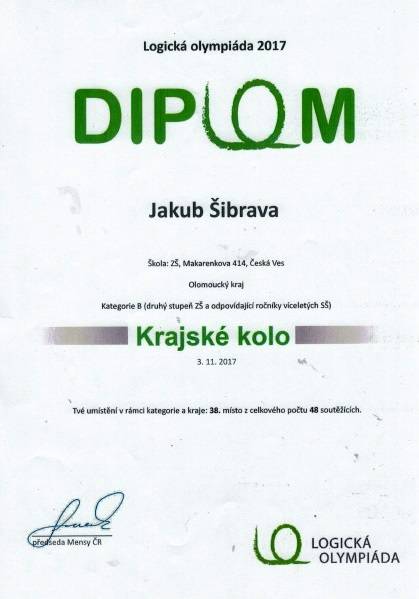 Logická olympiáda - krajské kolo18.12.201744.místo - Michal Kubala, VII.B 48.místo - Jana Trunečková, VIII.A 38.místo - Jakub Šibrava, IX.A Fotografie