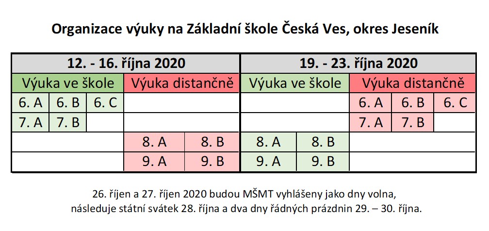 V týdnu od 12. do 16. října 2020 ZŮSTÁVAJÍ DOMA žáci 8. a 9. ročníku. Výuka bude probíhat distančním způsobem dle platného rozvrhu. Úkoly a termíny videokonferencí budou učitelé žákům posílat přes Google Učebnu (jako na jaře).
