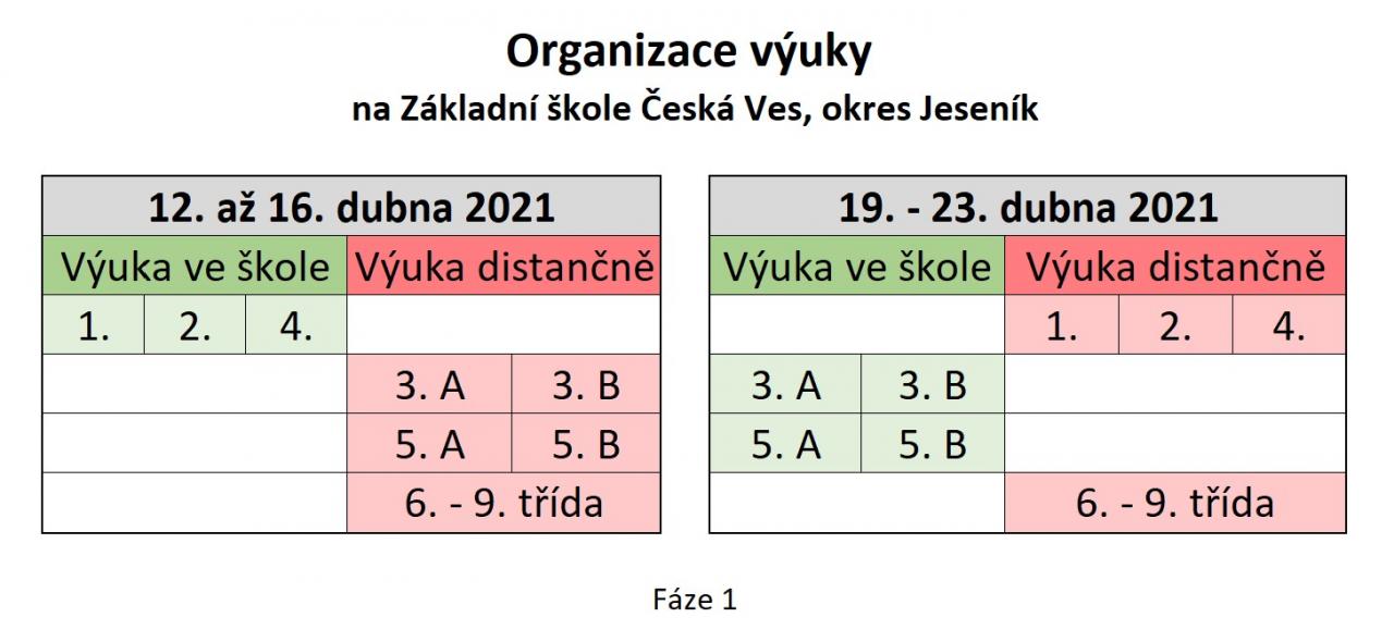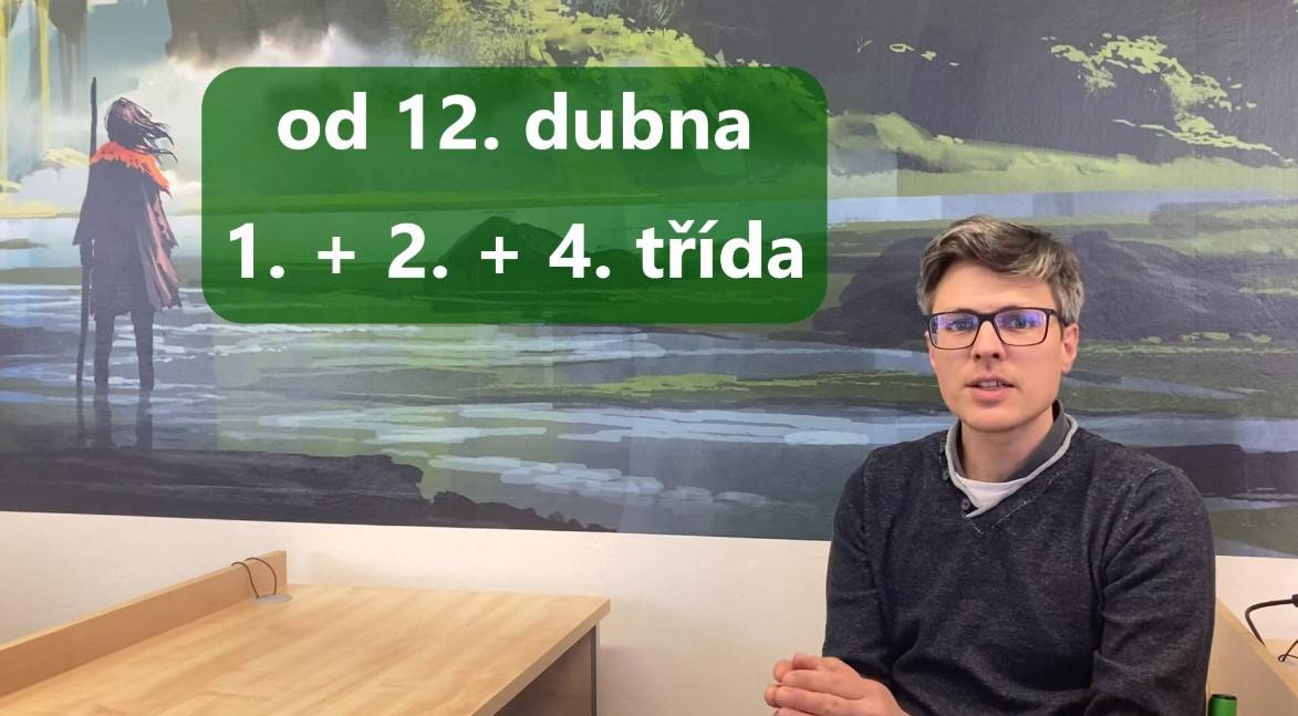 - Sudý týden: Od 19. dubna do školy přijdou žáci 3. A, 3. B, 5. A a 5. B. Družina bude v provozu ráno od 6:30 hodin pro 3. ročník, odpoledne pak pro 3. i 5. ročník do 16 hodin.