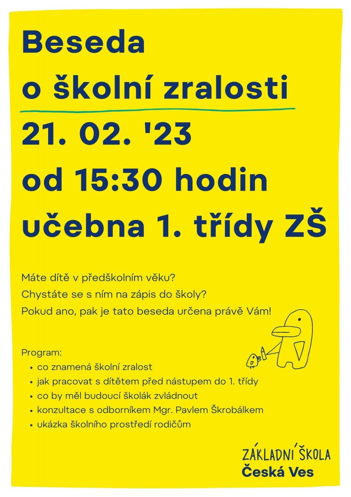 zveme Vás na besedu o školní zralosti, která se uskuteční v úterý 21. února 2023 od 15:30 v učebně 1. třídy na základní škole v České Vsi.