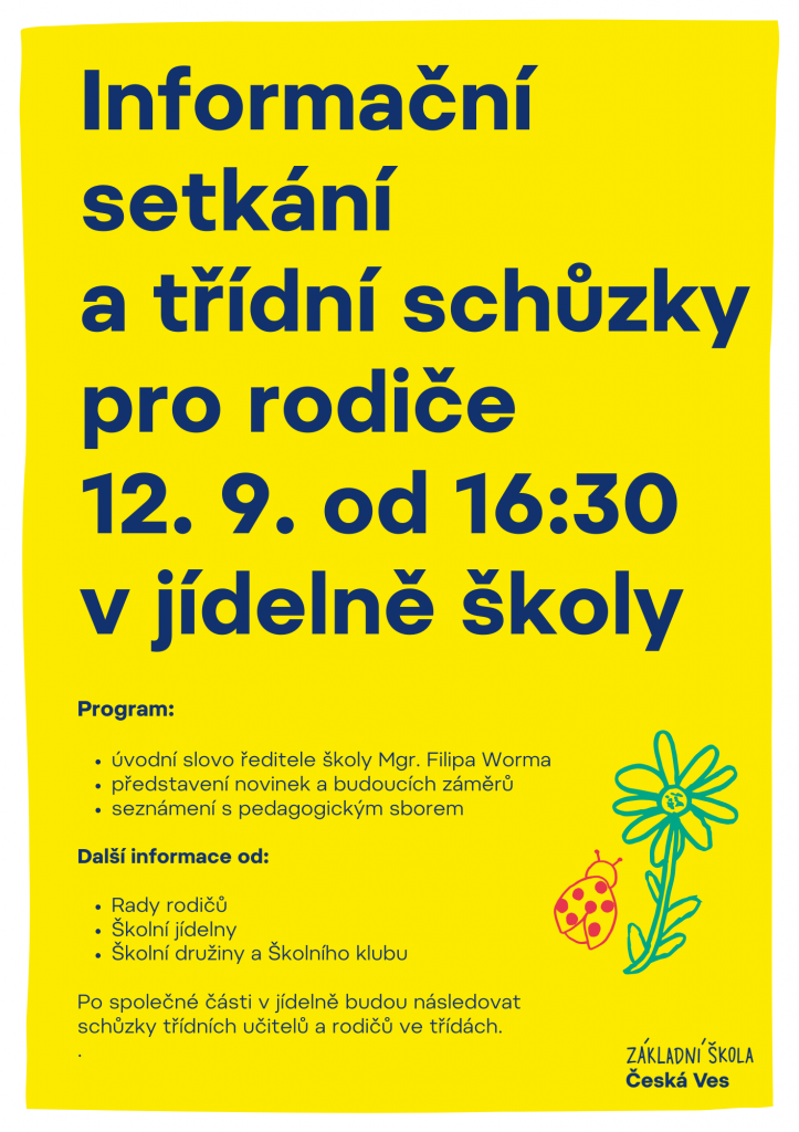 Informační schůzka a třídní schůzky rodičů07.09.202312. 9. od 16:30 ve školní jídelně Ke stažení 2023-09 Informační schůzka s rodiči.pdf
