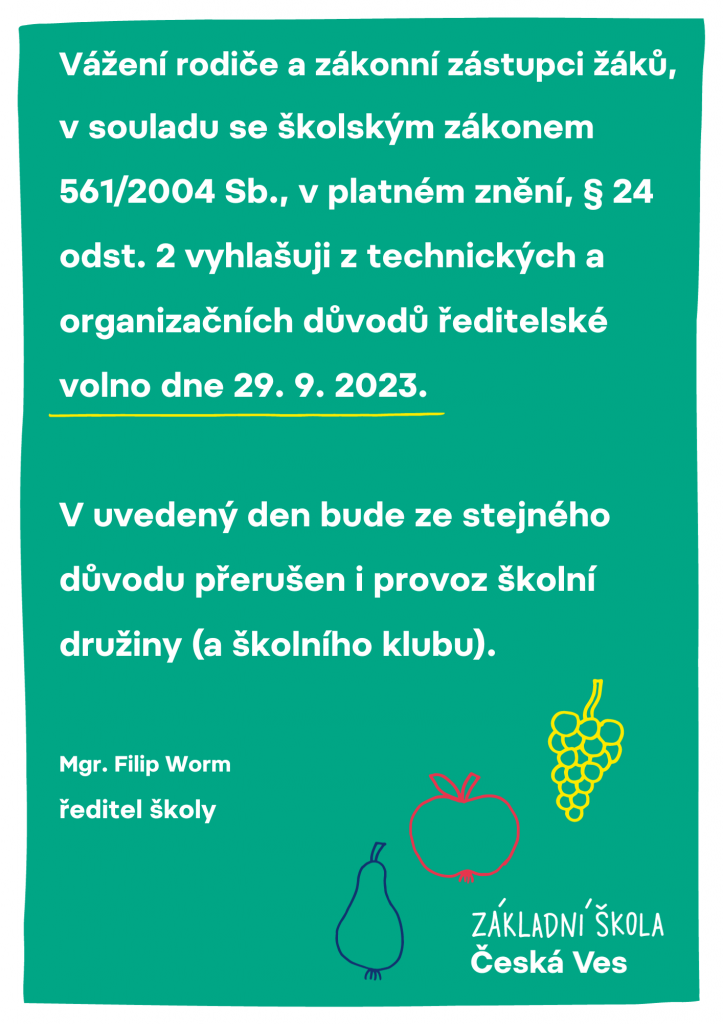 ŘEDITELSKÉ VOLNO18.09.2023Dne 29.09.2023 bude z technických a organizačních důvodů vyhlášeno ředitelské volno. V uvedený den bude uzavřena školní družina i klub.