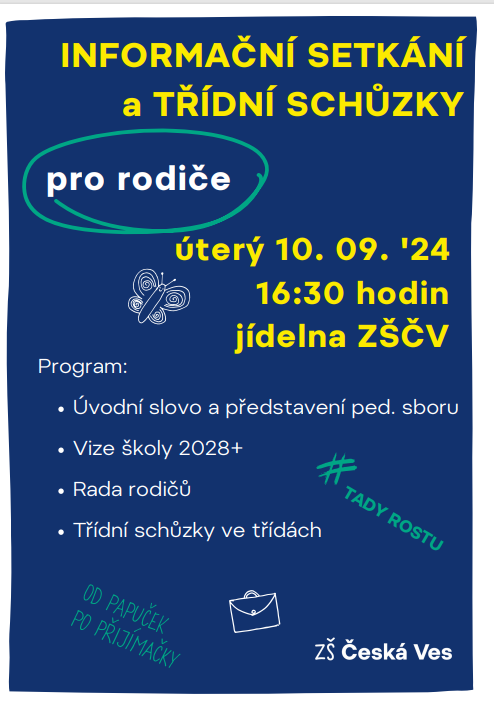 Informační setkání a třídní schůzky 10.9. od 16:30 hodin05.09.2024Informační setkání a třídní schůzky v jídelně školy 10. 9. od 16.30 hodin.