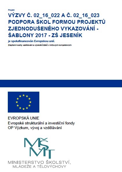 Název projektu: Šablony VLNKA 2017 Registrační číslo: CZ.02.3.68/0.0/0.0/16_022/0007198 Doba trvání projektu: 1.09.2017-31.08.2019 Příjemce podpory: Základní škola Česká Ves, okres Jeseník Operační program: Operační program Výzkum, vývoj a vzdělávání Rozpočet projektu: 1 034 286,00 Kč Projekt je zaměřen na osobnostně profesní rozvoj pedagogů, společné vzdělávání žáků, podporu extrakurikulárních aktivit, spolupráce s rodiči dětí a žáků. Klíčové aktivity projektu Školní asistent - personální podpora ZŠ Cílem této aktivity je poskytnout dočasnou personální podporu - školního asistenta základním školám. Aktivita umožňuje vyzkoušet a na určité období poskytnout větší podporu zejména žákům ohroženým školním neúspěchem. Vzdělávání pedagogických pracovníků ZŠ - DVPP v rozsahu 16 hodin_Čtenářská gramotnost Vzdělávání pedagogických pracovníků ZŠ - DVPP v rozsahu 16 hodin_Matematická gramotnost Vzdělávání pedagogických pracovníků ZŠ - DVPP v rozsahu 16 hodin_Cizí jazyky Vzdělávání pedagogických pracovníků ZŠ - DVPP v rozsahu 16 hodin_Inkluze Cílem aktivity je podpořit profesní růst pedagogických pracovníků pomocí dlouhodobého vzdělávání a průběžného sebevzdělávání. Vzdělávání pedagogického sboru ZŠ zaměřené na inkluzi - vzdělávací akce v rozsahu 8 hodin Cílem aktivity je podpořit profesní růst pedagogických pracovníků pomocí dalšího vzdělávání prostřednictvím ucelených vzdělávacích programů. Jednotka umožní pozvat lektora přímo do školy, a tak ušetřit pedagogům cenný čas. Sdílení zkušeností pedagogů z různých škol prostřednictvím vzájemných návštěv (pro ZŠ) Cílem je podpořit pedagogy základních škol ve zvyšování kvality jejich každodenní práce při vzdělávání a výchově žáků, a to prostřednictvím vzájemné výměny zkušeností mezi pedagogy z různých škol v rámci ČR. CLIL ve výuce na ZŠ Cílem je prohloubit znalosti pedagogických pracovníků (těch, kteří nevyučují vzdělávací obor Cizí jazyk) a zároveň zvýšit jejich kompetence ve využívání metody CLIL při výuce nejazykových předmětů. Nové metody ve výuce na ZŠ_Matematická gramotnost Cílem šablony je prohloubit profesní kompetence pedagogických pracovníků prostřednictvím vzájemné spolupráce s využitím prvků mentoringu. Čtenářský klub pro žáky ZŠ Cílem aktivity je realizace čtenářského klubu pro žáky základní školy. Má formu volnočasové aktivity a vede k rozvoji klíčových kompetencí. Takto získané znalosti, dovednosti a kompetence se také promítají i do povinné složky vzdělávání žáka. Aktivita umožňuje vedle rozvoje žáků i profesní rozvoj pedagogických pracovníků. Klub zábavné logiky a deskových her pro žáky ZŠ Cílem aktivity je realizace klubu zábavné logiky a deskových her pro žáky základní školy. Má formu volnočasové aktivity a vede k rozvoji klíčových kompetencí. Aktivita vede k rozvoji logického (ale i informatického) a strategického myšlení žáků. Takto získané znalosti, dovednosti a kompetence se také promítají i do povinné složky vzdělávání žáka. Aktivita umožňuje vedle rozvoje žáků i profesní rozvoj pedagogických pracovníků. Doučování žáků ZŠ ohrožených školním neúspěchem Cílem aktivity je podpořit žáky ohrožené školním neúspěchem prostřednictvím možnosti doučování. Jednotka může být také využita pro žáky ze sociálně znevýhodněného a kulturně odlišného prostředí, kterým aktivita může napomoci upevnit jejich zvyk provádět samostatnou odpolední přípravu a podpořit zvládnutí standardů daných Rámcovým vzdělávacím programem např. v hlavních předmětech český jazyk, matematika a cizí jazyk. Odborně zaměřená tematická setkávání a spolupráce s rodiči žáků ZŠ Cílem aktivity je poskytnout rodičům informace spojené s konkrétními tématy souvisejícími s modernizací škol a vzdělávacího systému a dostatečný prostor k diskusi. |
